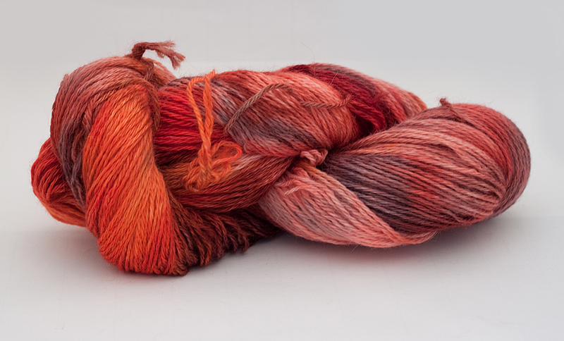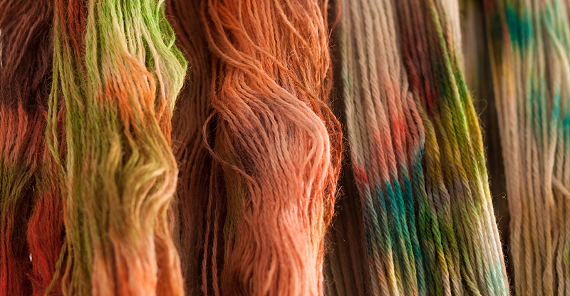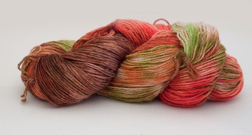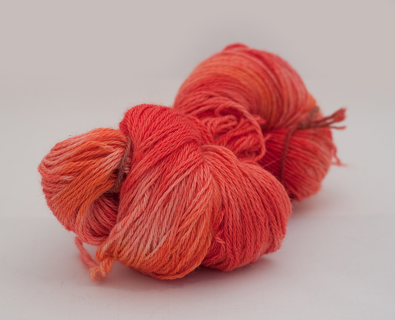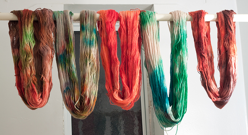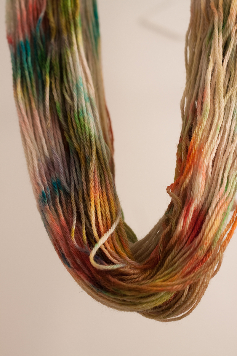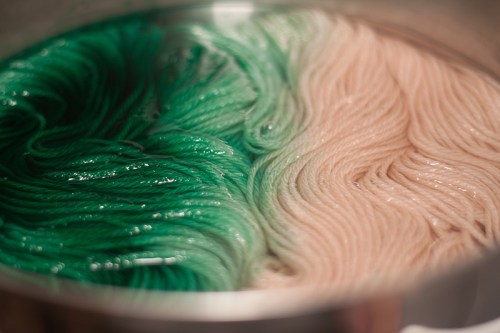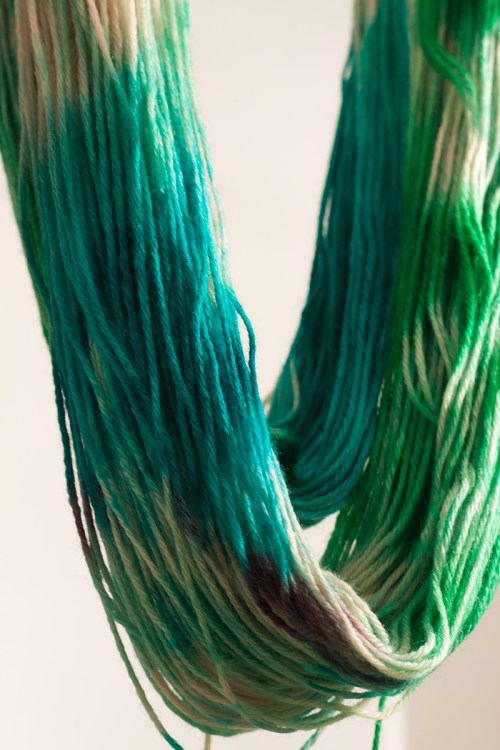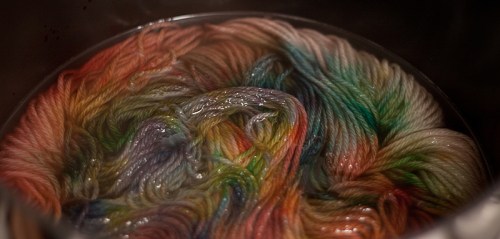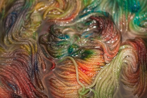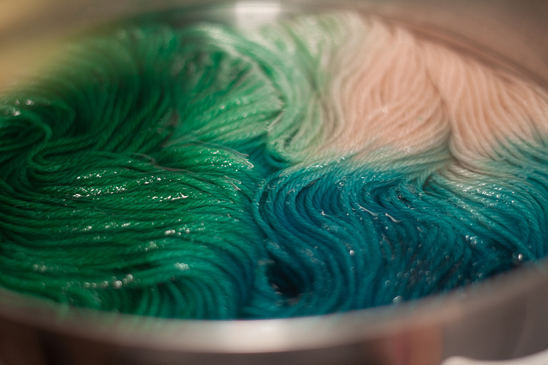 The left, middle, and right skeins were dyed using Kool Aid – the coverage on them is much better. I’m not sure how to fix this, definitely some research needed.