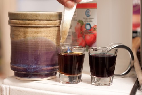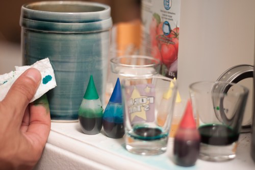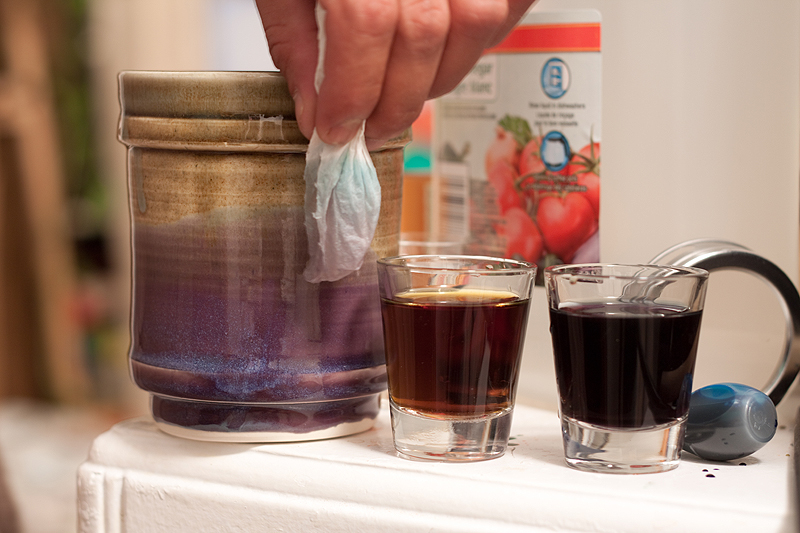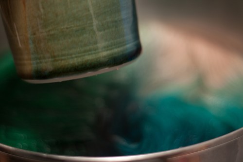 Take II – this time Tito is involved in an effort to get me to use a more measured approach. Or at least, to not stain the countertops. Here he is mixing up the blue and matching it to the pot.