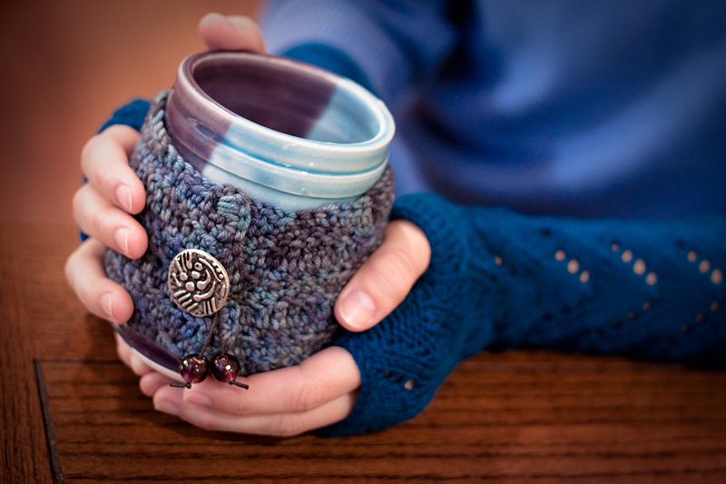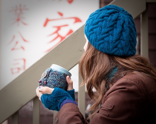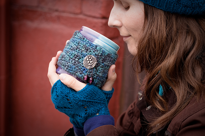 Yvette is modelling my Lacy V fingerless gloves and slouch hat in ocean blue merino. She’s holding one of my Wooly Teacups in purple and blue glaze with a crocheted cosy in gorgeous stormy hand-dyed yarn by Tanis Fiber Arts. She’s also wearing a diagonal lace scarf in turquoise lace-weight yarn.