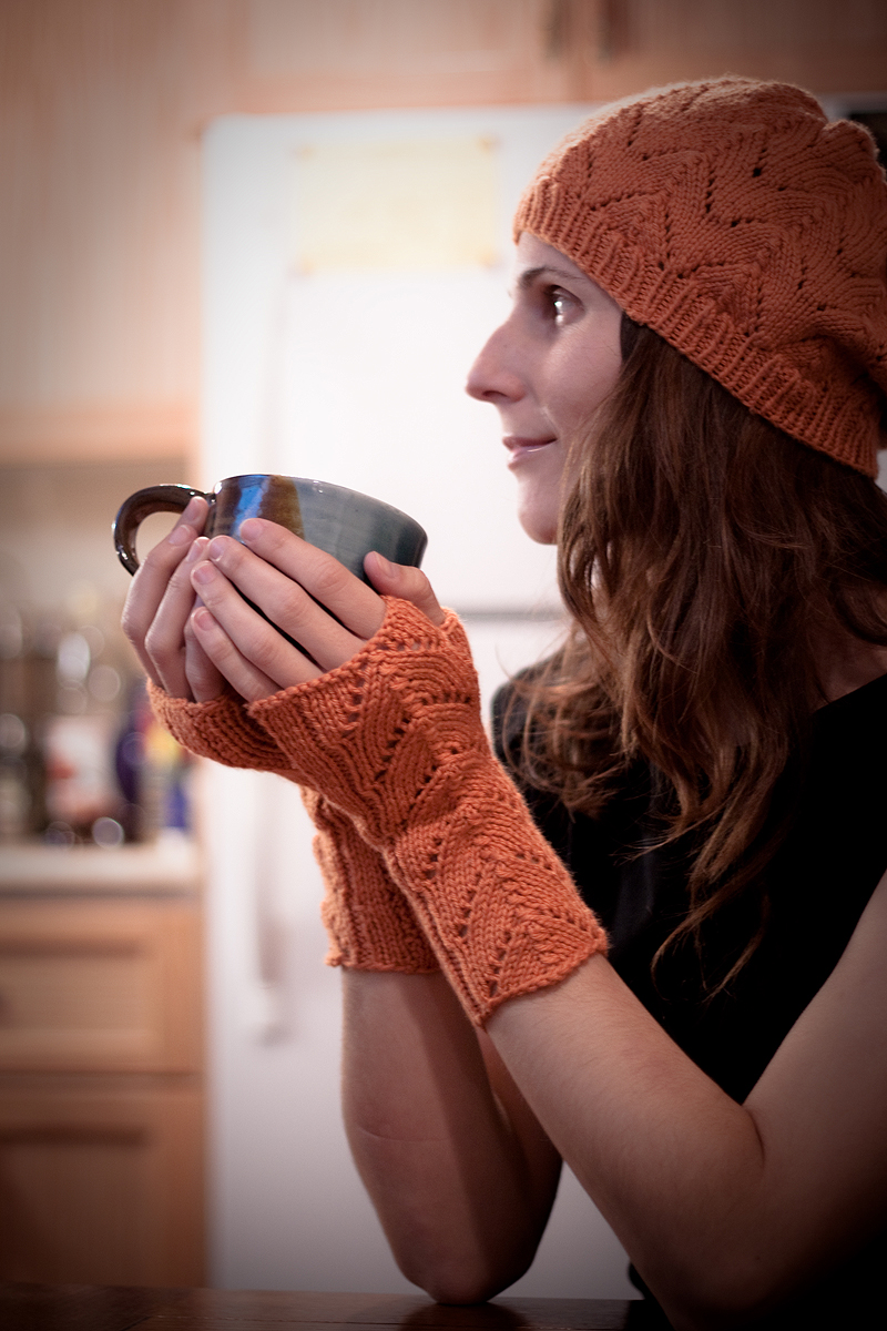 She also helped me show off my Horseshoe Lace fingerless gloves and slouch hat, while holing one of my 4-colour glazed mugs.