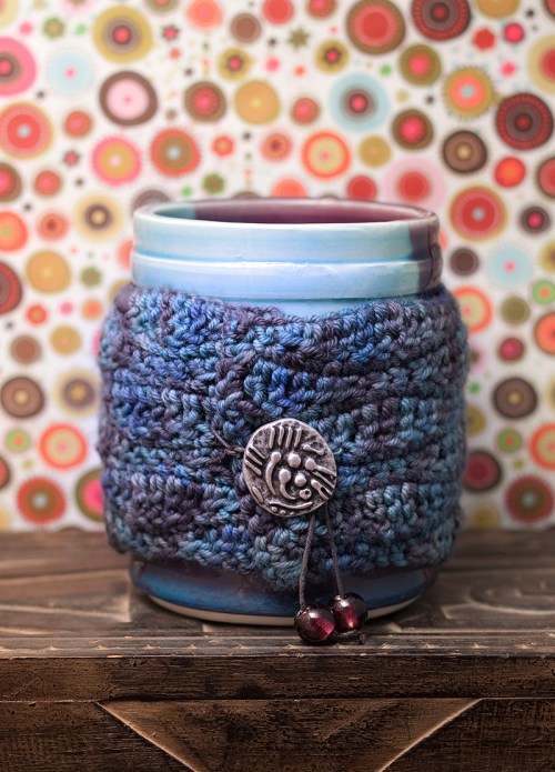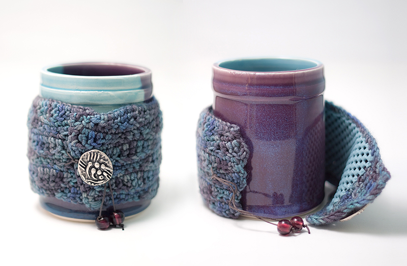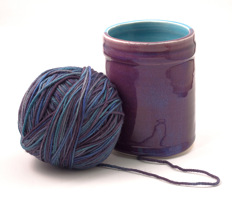 Some work went into figuring out the shape to throw, I settled on a mug with extruded rings at the top and bottom, to give the cosy a place to sit and keep it from sliding off. I also went through quite the adventure trying to find the perfect yarn match for each glaze. I wanted each mug to be different. This purple-blue one is paired with a skein of Stormy by Tanis – a match made in heaven!