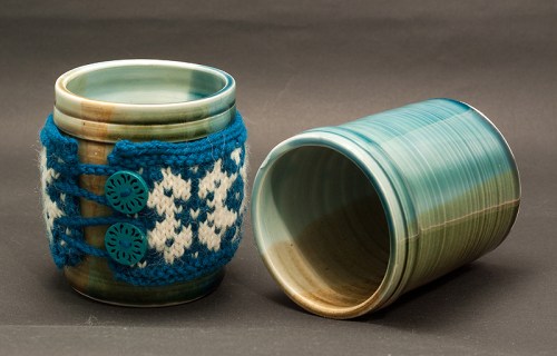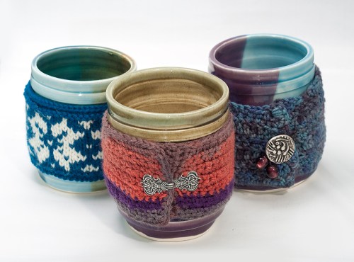 And how do they work you ask? They are lovely, when I filled mine up with hot chocolate the warmth seeped through the clay body and into the cosy. There are no handles and the mugs are definitely comfort-sized, so it’s a two-hander, but a warm and wooly tea cup is the perfect thing to wrap your hands around when coming in from the cold =o) These lovelies will be available at my show next month!