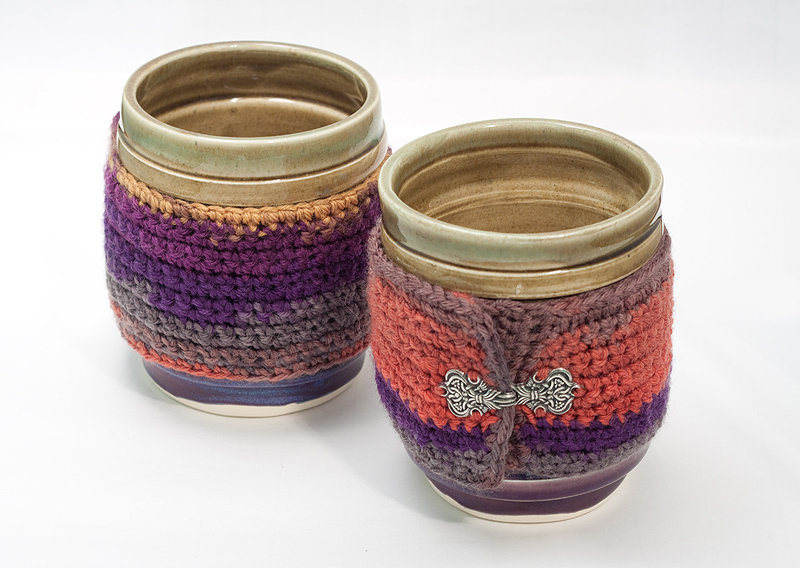 When Kris and I were in Hawaii, (what a strange place to think of cold-weather drinks) I came up with an idea for combining two of my loves into a cute, comfy drinking vessel that would feel cozy in your hands when filled with hot yummy drinks. I came back to discover that the concept of the knitted mug cosy had been done, and done, and done. Undaunted I determined to evolve the idea into something fresh and fun and unique, and so was born the wooly muggeths.