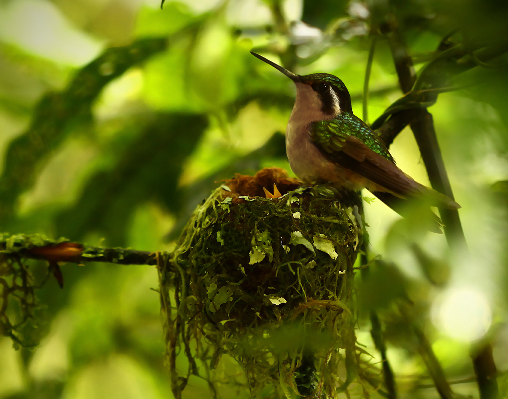 I am so proud of this photo, I had to crouch in a very uncomfortable position waiting for this beautiful emerald hummingbird to come back to her nest and feed her baby. This photo was taken in the Monteverde Cloud Forest in Costa Rica.