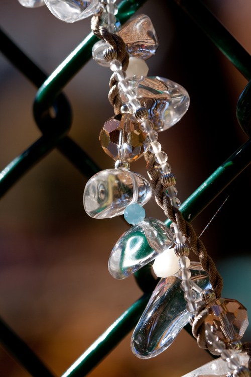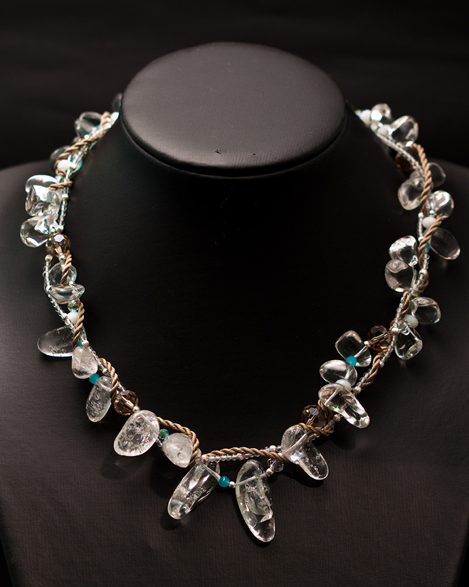 Running through the necklace and woven in between the beads are two ropes – one of tiny quartz crystal and sterling silver beads, and one of tan coloured pure silk rope – meant to be evocative of the delicate branches under the ice.