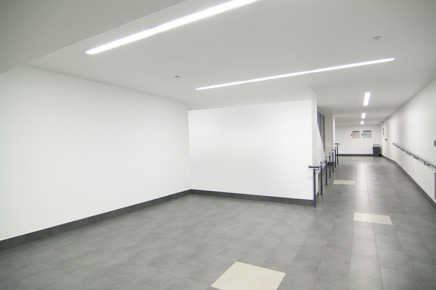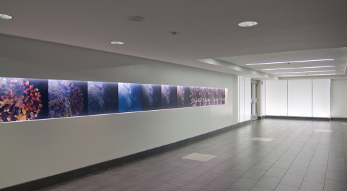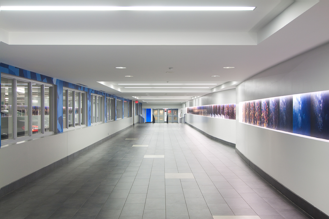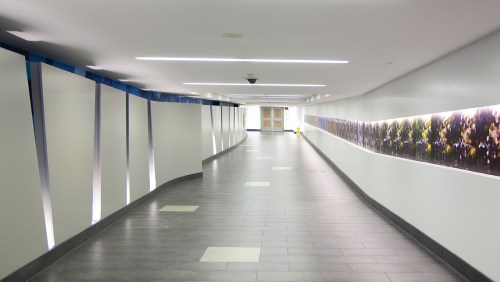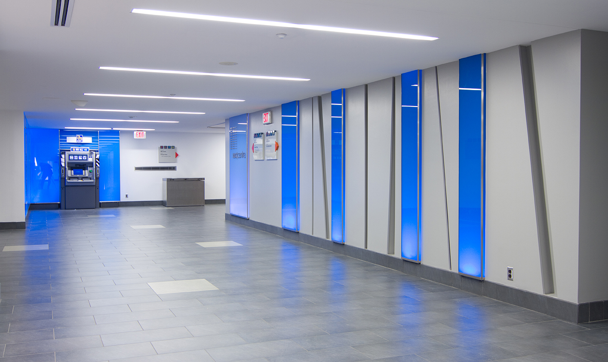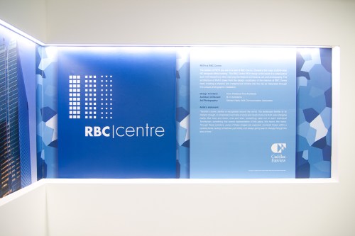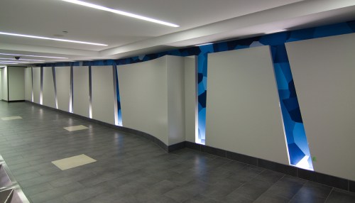 And the North Hall today! I contributed the photography and the panoramic strip on the right, as well as the design of the diagonal shapes on the left – meant to be evocative of design elements in the building above – the RBC Centre. To this KPF added the running strip on the top, and the curves in the surface of the wall. I think the results are very cool.