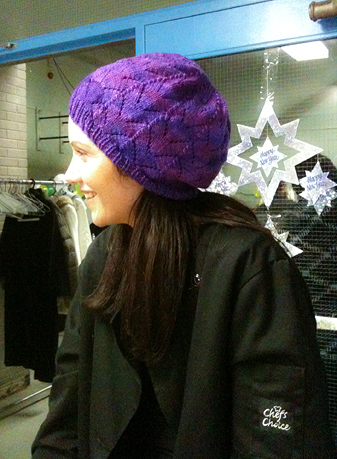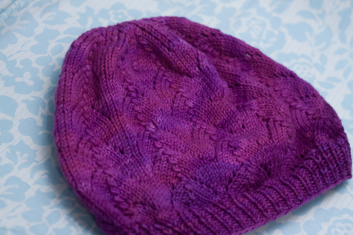 I followed the directions for making it extra slouchy, adding two pattern repeats. The gorgeous purple yarn is called Jewel, and it’s by Tanis Fiber Arts. This is my first time knitting with Tanis yarn – usually I crochet it, and I have to say it’s pretty amazing to work with. After blocking Tanis yarn relaxes a lot, allowing the lace pattern to open up beautifully. It relaxes so much in fact, that I do recommend blocking your swatch before taking measurements when working on large pieces.