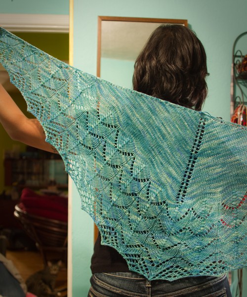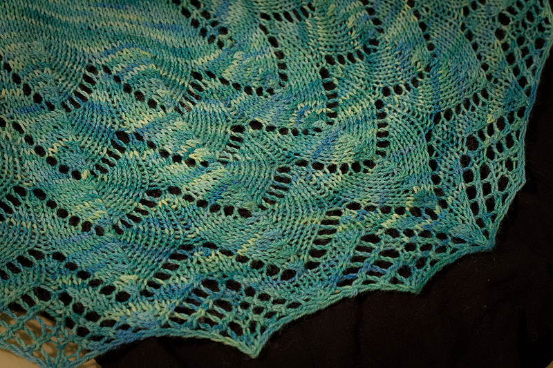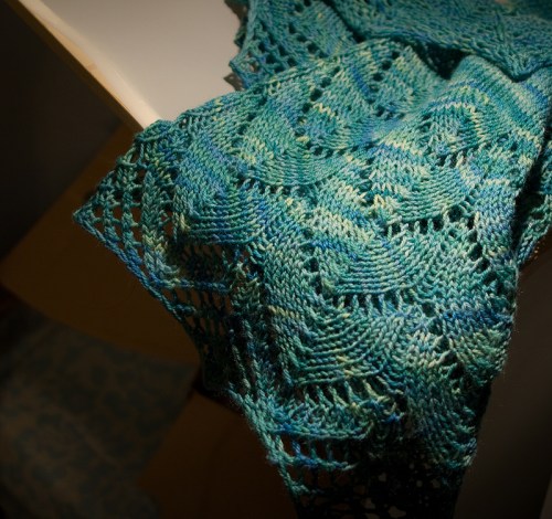 I’ve just completed my very first knitted shawl! The pattern is the Travelling Woman by Liz Abinante. The yarn is TFA Blue Label in Mallard. Thank you Tanis, for the recommendation! This was an ideal first lace shawl – the purl columns as well as the sk2po column make it easy to read your knitting and keep track of where you are.
