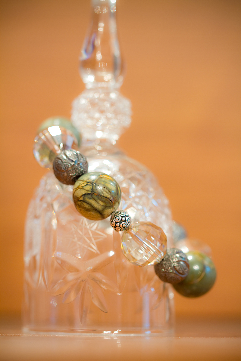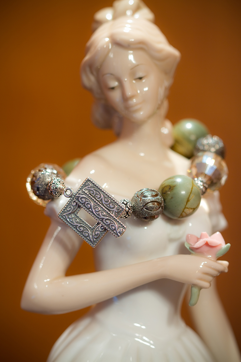 We also created this elegant bracelet. Sterling silver filigree clasp, polished agate beads and oversized faceted Swarovski crystals on a thin, doubled steel cable for strength.