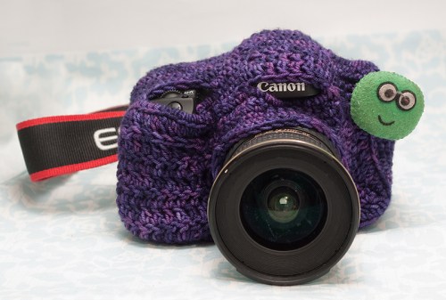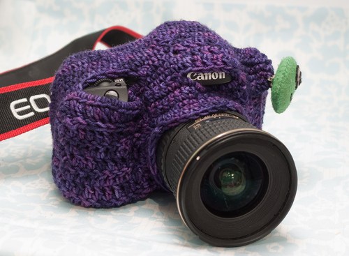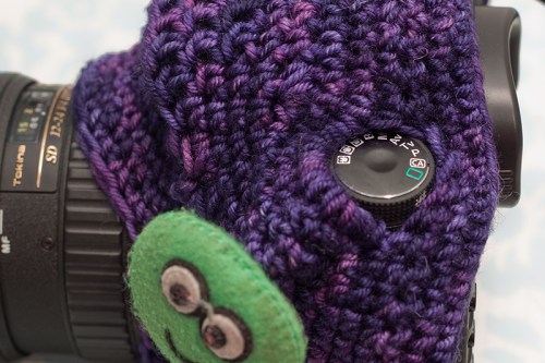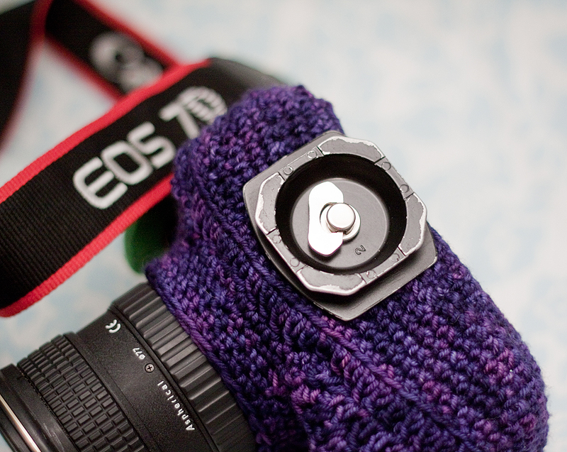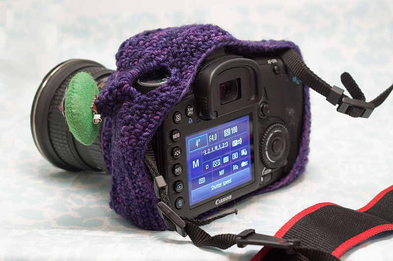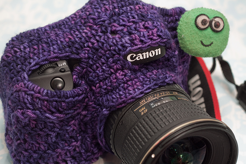 This is the Canon 7D. Swaddled in TFA Grape. Yes, I said swaddled. Because nothing says love like TFA yarn. No Patons cop-out for my camera!
