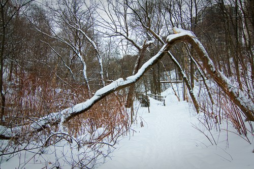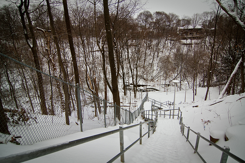 These are the snowy steps leading down into the ravine by my place. For those of you fixin’ to berate me about ‘being careful’ on those stairs let me assure you I exercised utmost caution – what makes you think I would ever risk the safety of my camera?