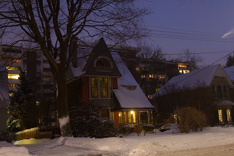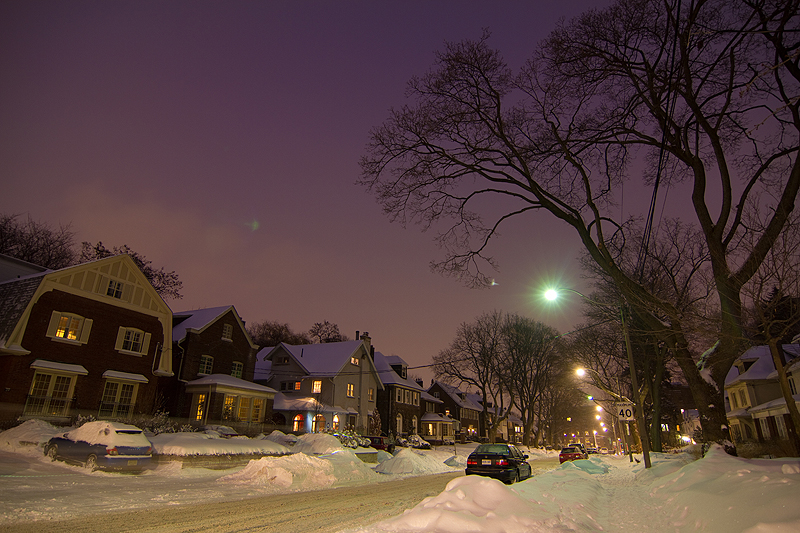 I love the colour the sky turns when it’s snowy like this – the reflection of the city lights on all that white gives the sky a warm tinge at night.
