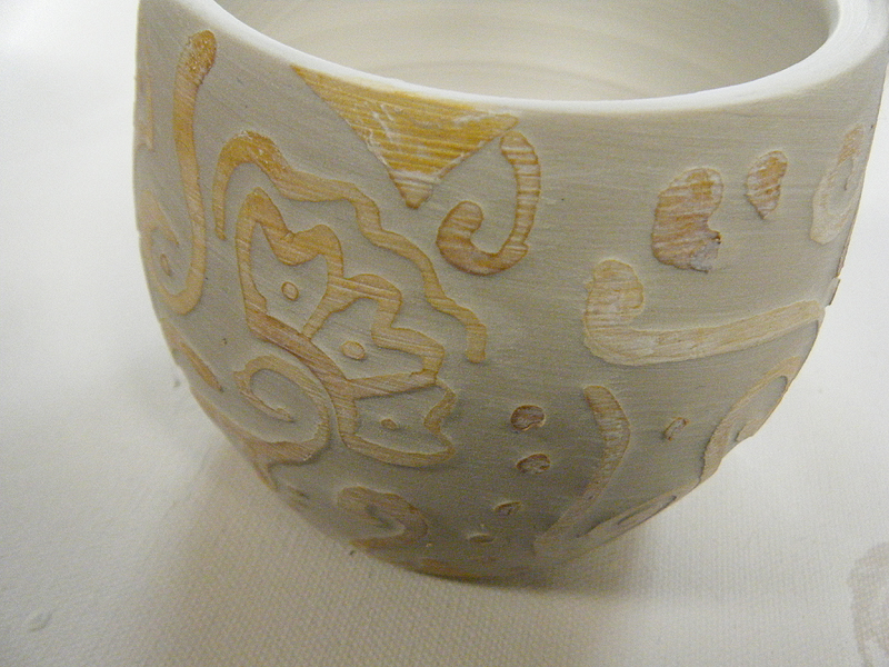 Then you rub the clay gently with a damp sponge. The sponge starts to remove clay from your piece, but not where the shellac is – resulting in a raised design.
