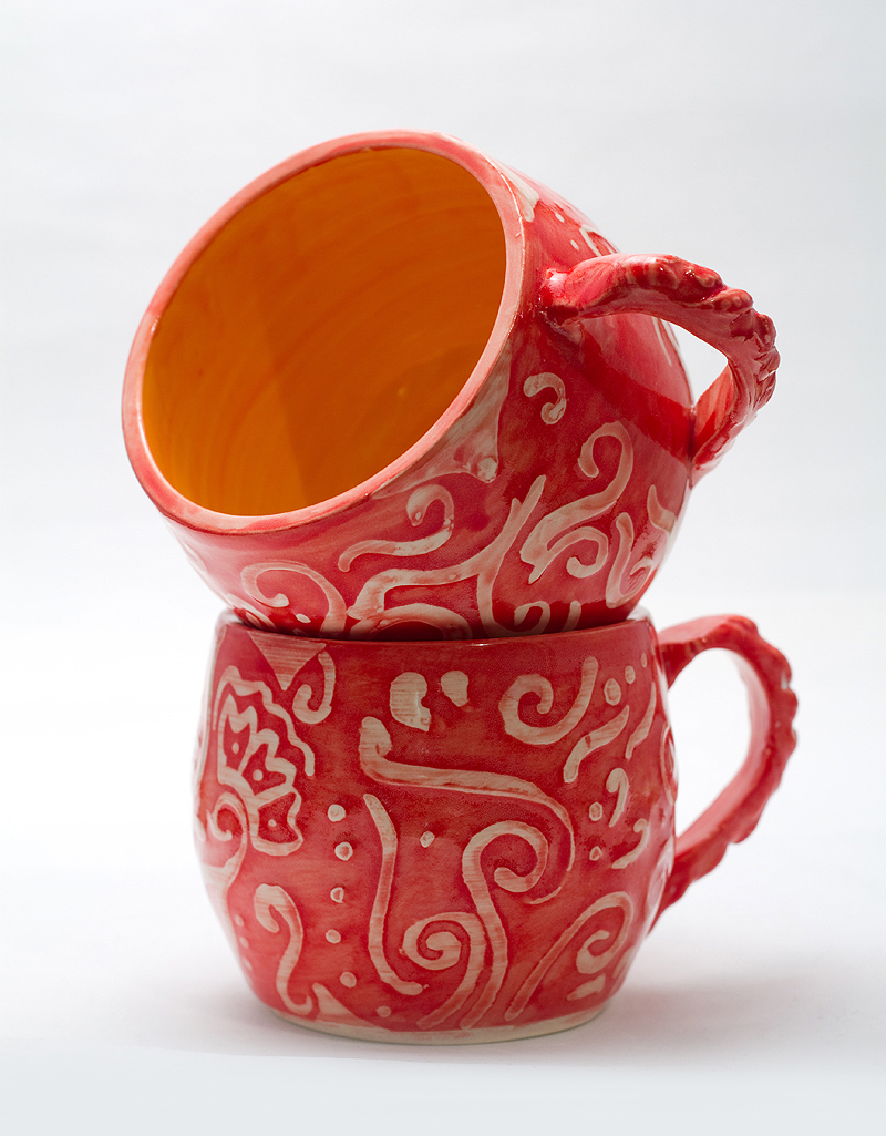There is a fun technique involved here that I just learned, and that I think I will be addicted to for a while. It’s hard to tell in the photo, but not only is the filigree design a different colour than the mug body, but it’s in relief.