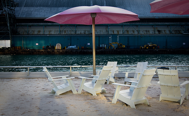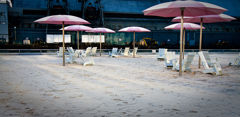 One such place is called sugar beach – on one side of the water is an old (but functional) industrial looking Redpath sugar refinery. There is a dark water lane way for giant ships to pull in beside it, and on the other side is a brand new beach, complete with white sand, white muskoka chairs and happy pink umbrellas. Because we had a warm, clear evening I decided to enjoy it by doing a photographic study of the area.