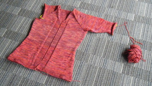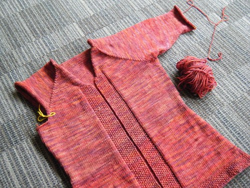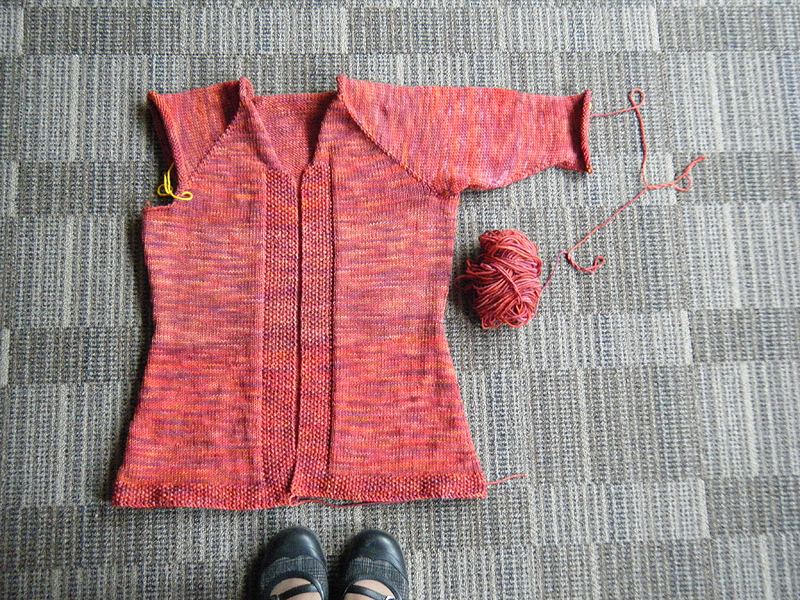 6 balls of TFA Green label Sunset, and a relatively simple top down cardi. Some waist, neckline and sleeve shaping (new to me) and what I believe is called Raglan sleeves. I’ve had to work with my old friends, the DPNs for the sleeve shaping. You can see a lighter band around the chest area, there is a slight colour shift where I switched skeins. I don’t mind it, and after blocking it might be more subtle. TFA yarn is all hand dyed goodness, so some variation is expected I’m sure – and I’ve heard that you can ‘stripe’ your knitting to achieve consistency with hand dyed yarns – does anyone know how to do this? Email me if you do!