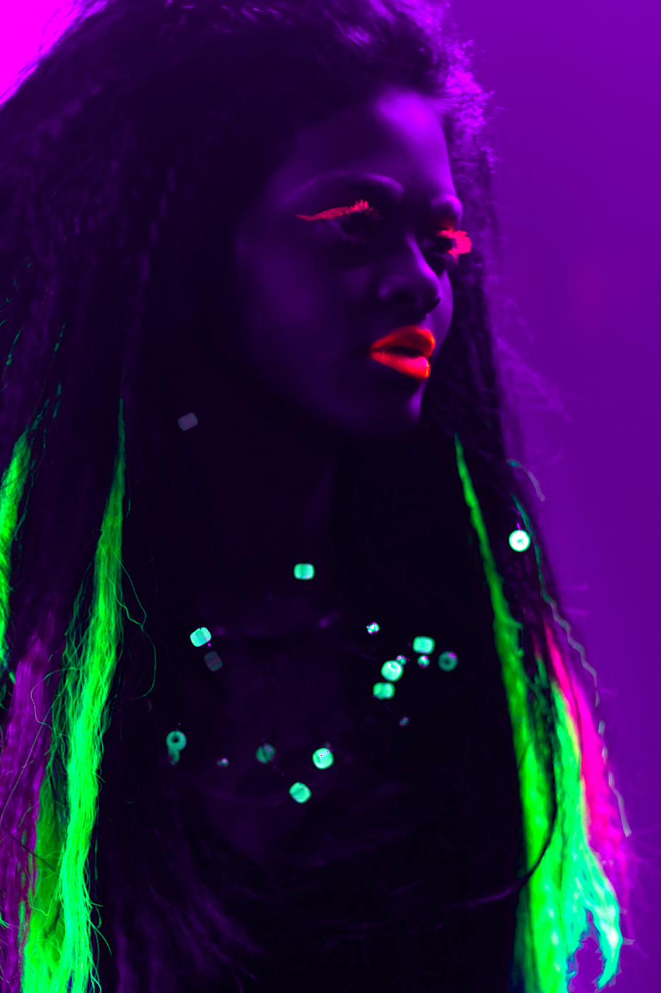 I used three different sizes of UV Reactive beads to vary it up, and the hack was using electrical tape over the base at the end – to disguise the silver in the choker and also to keep the wire ends from hurting the model.