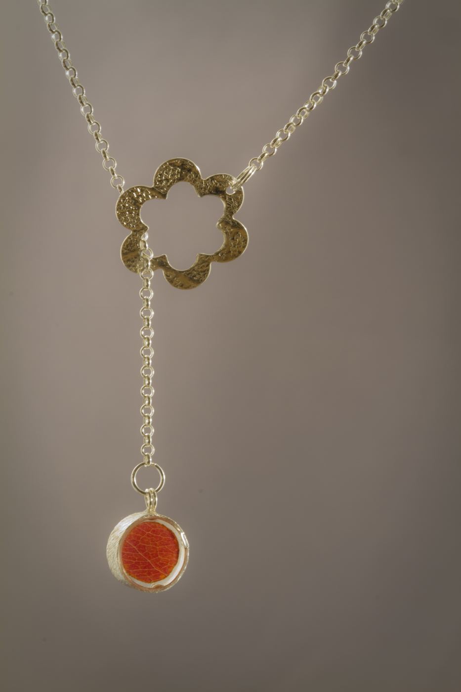 For this one I used sterling silver elements with brushed silver finishes. The small ring at the bottom contains a circle of maple leaf preserved in resin.