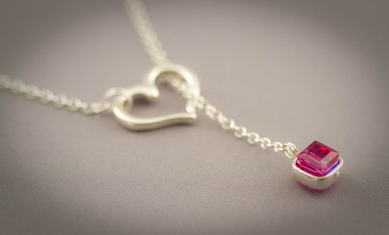Both of these are lariat style necklaces with clasps in the back. This one features a 6mm square cut swarovski wrapped in a sterling silver band.