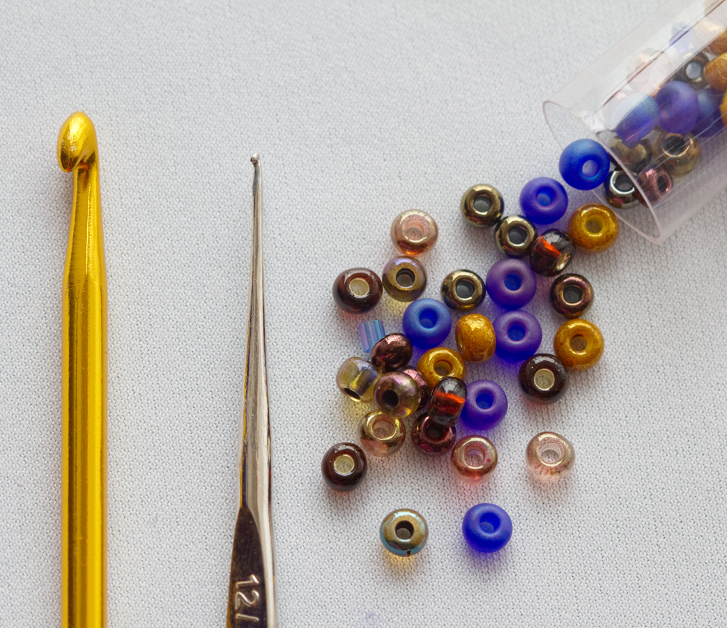 You will need a 3.75mm hook for the main body, a 1.0mm hook for the beads, and about 50 grams of size 6.0 seed beads.