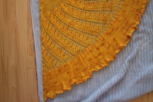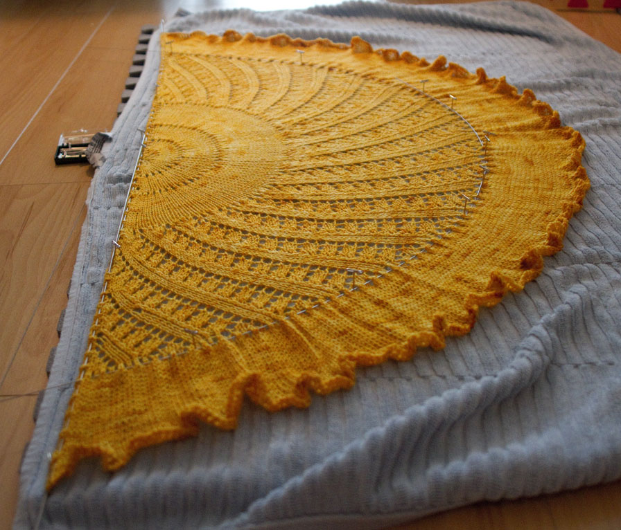 For the record here is how I blocked it – I ran worsted weight blocking wires through the top and then flexible lace weight wires through the last row of yarn overs at the end of the lace. I blocked aggressively to open the lace right up.