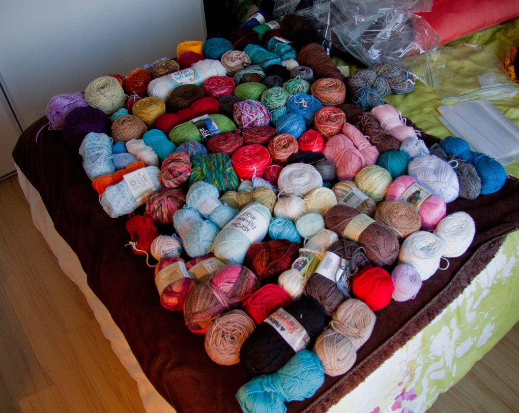 - 9 bags where I’m unsure of the fibre content but could certainly include wool. Novelty yarns are in this pile as well. – 3 bags of this are being added to the animal content bags that are going to the Humane Society Knitters. The other 6 are going to the Purple Purl here in Toronto who have lots of connections, such as streetknit, for the yarn to go to :)
