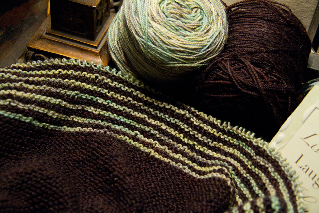 To end… here is the start on my Colour Affection shawl, knit in 2 TFA one of a kind skeins as part of Tanis’ TFA Colour KAL. Looks like mint chocolate – yummy!