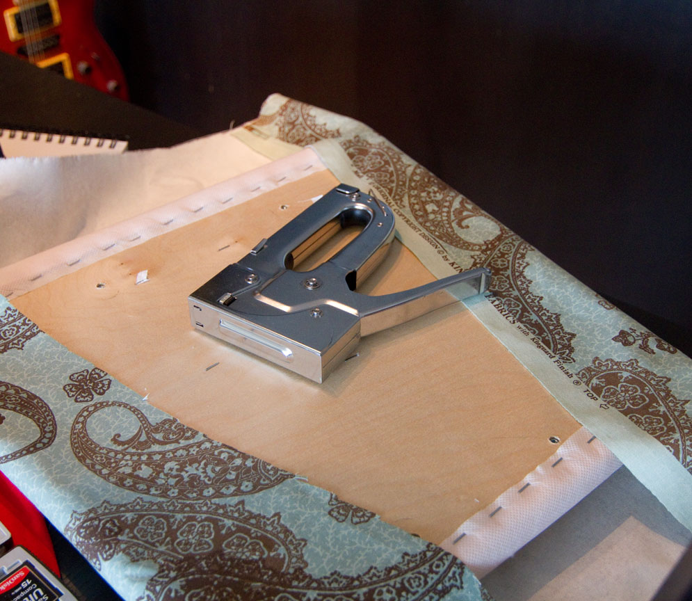 Starting on one side I secured the fabric with a few staples, folding it just at the edge to give it more strength and stapling through both layers. Then I pulled the fabric snugly over the opposite side and secured it there as well.