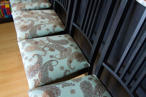 Reupholstering a chair, it turns out, is super easy. I got some fabric I liked that was sort of canvas thickness, a pair of scissors and a staple gun. I took off the seats and used them to roughly measure out a square the size of the seat.