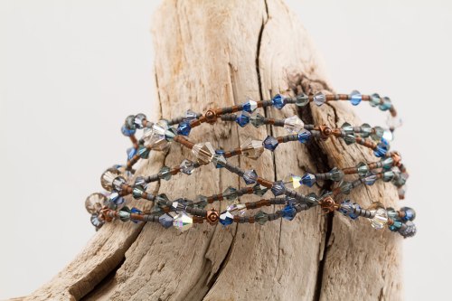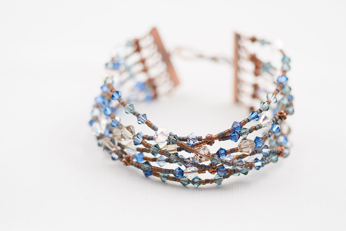5 different sizes and colours of Swarovski are paired with charcoal and earth coloured Japanese glass delicas, and strung onto 7 different strands that cross cross each other to form this organic little bracelet.