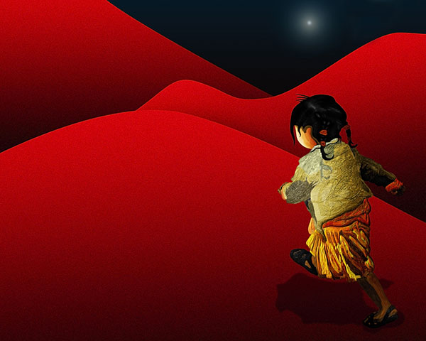 Then I entered this little rural village in the middle of nowhere and there was this little girl, Dinah. She was shy with the camera, but wanted me to play and chase her around. I took off after her and while I was running I snapped the pic that would end up being the basis for the red girl.