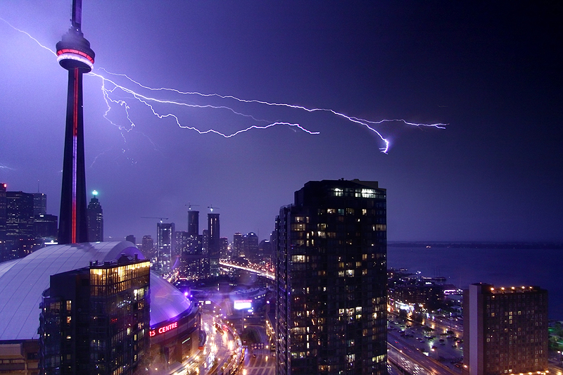 Lightning strikes the CN Tower an average of 75 times per year. Long copper strips run down the CN Tower to massive grounding rods buried below ground to prevent damage. I’ve had the good fortune to get a few great shots of this happening.