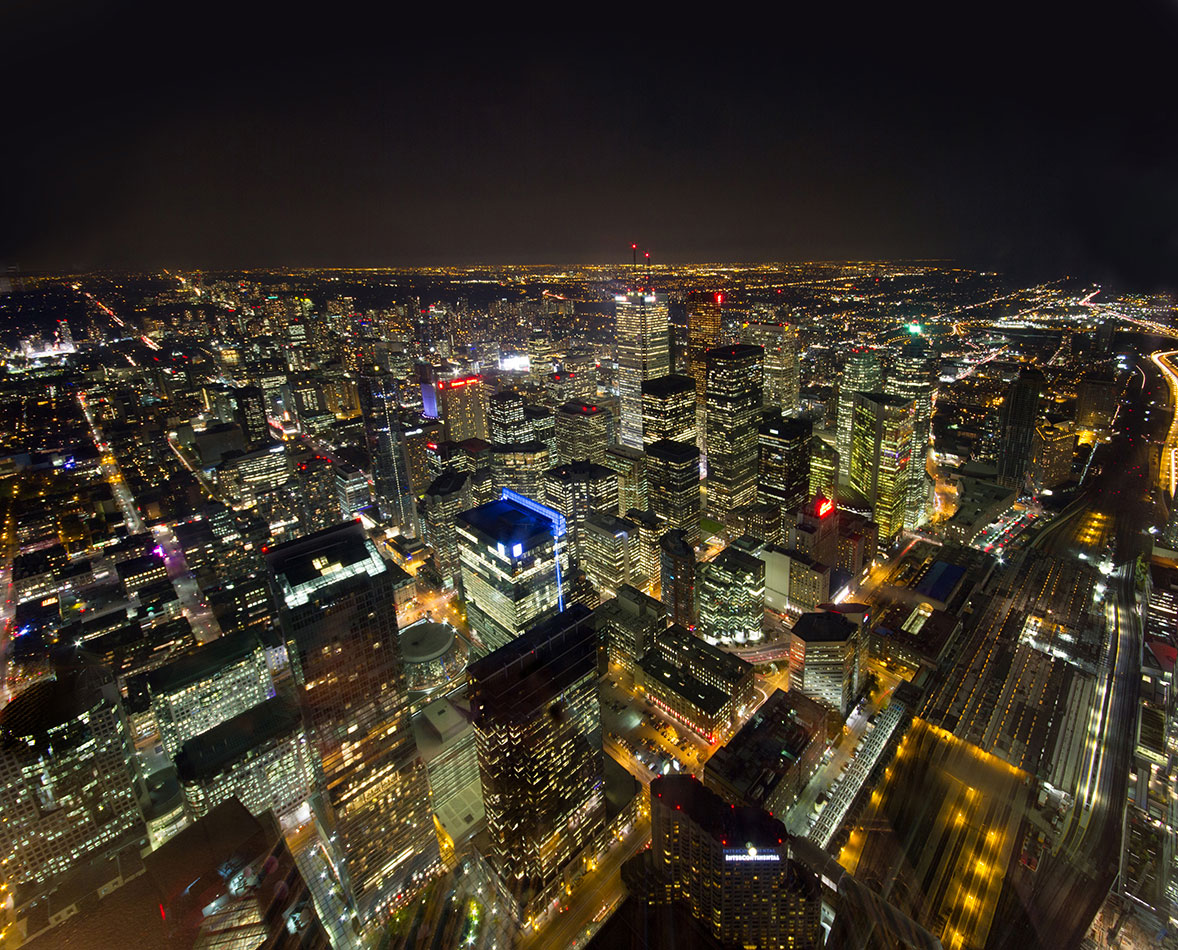 On a clear day, visitors to the CN Tower’s observation deck can see over 160 kilometers (100 miles) — that’s all the way to Niagara Falls and across Lake Ontario to New York State. Here is a photo of the view of the business core that I took at night.