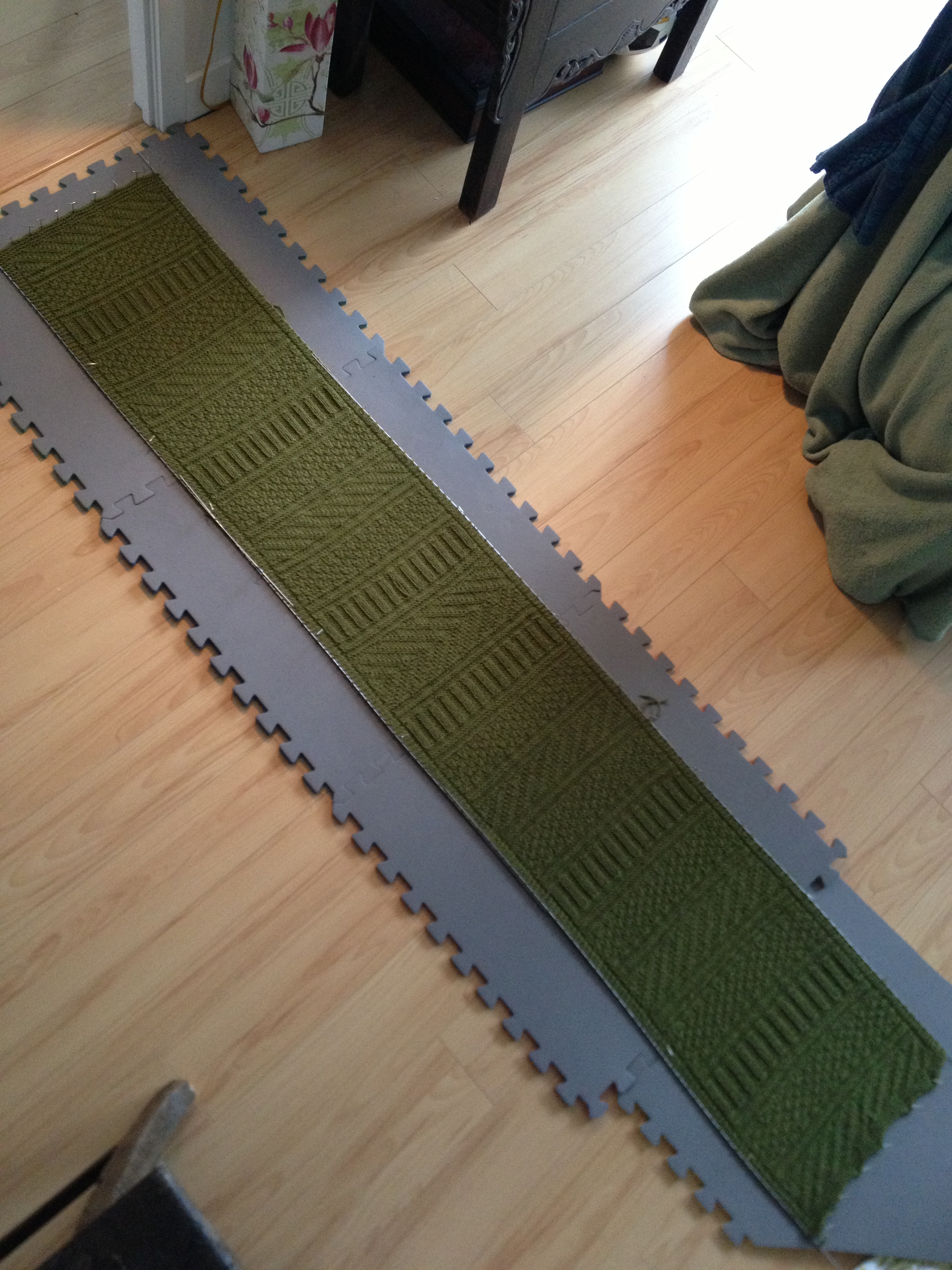 Tito (what a sport) says he loves it, and it looks pretty darn good on him, it ended up at an impressive 80 x 13.5 inches and it weathered the trip well, having been knitted all over creation with the trucks cup holder serving as my yarn bowl.