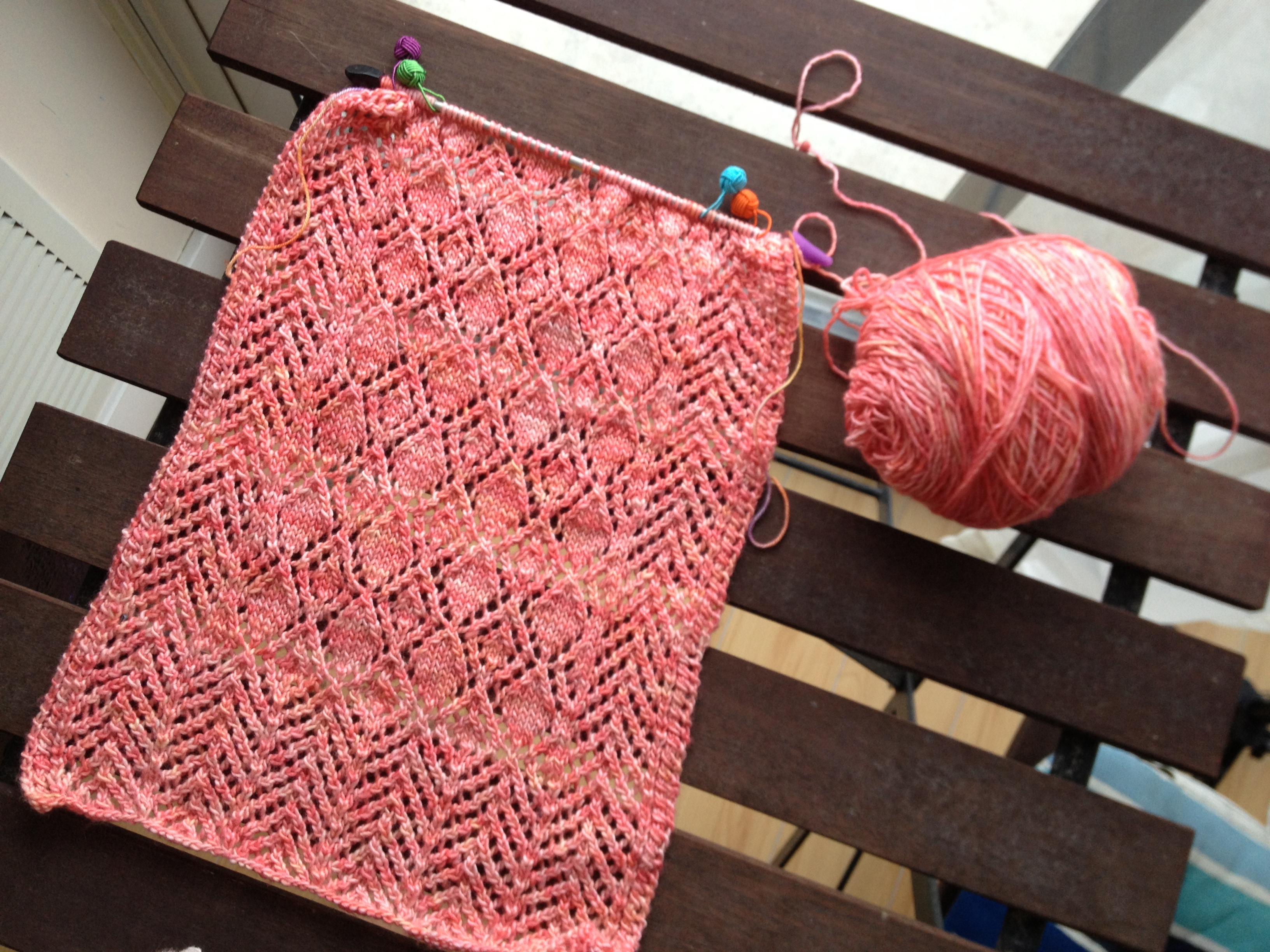 This is the Fairview Scarf by Tanis, and I’m working in the delicious TFA Red label Cashmere/Silk in the colourway ‘grapefruit’. It’s for a friend, but the only clue I’ll give as to who is this: if you hate pink, and I know it, then it isn’t you ;)