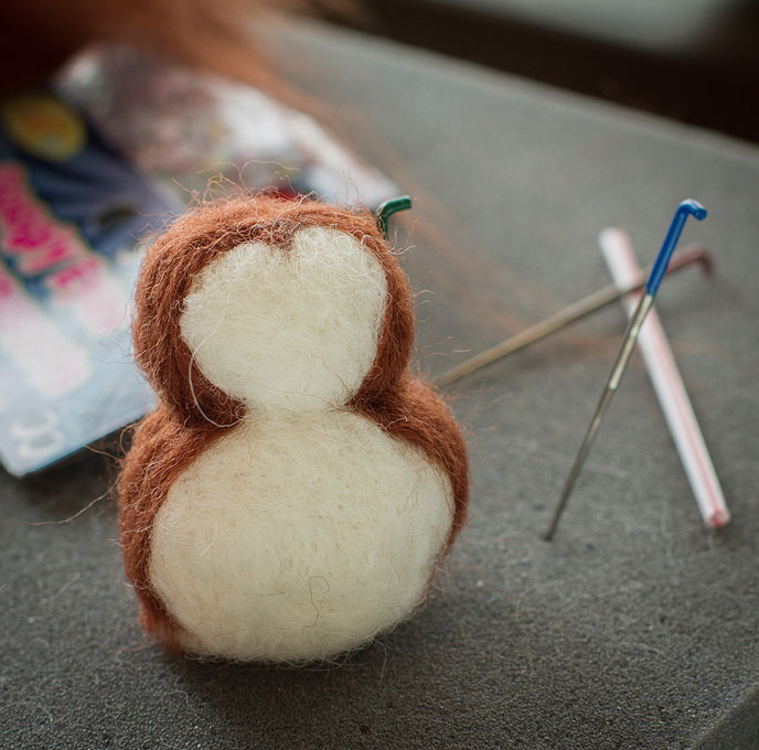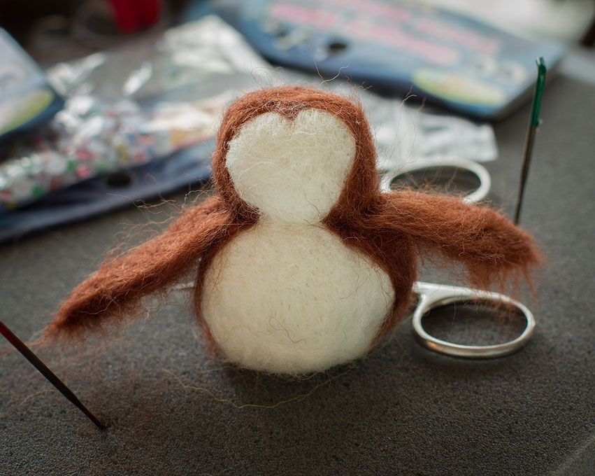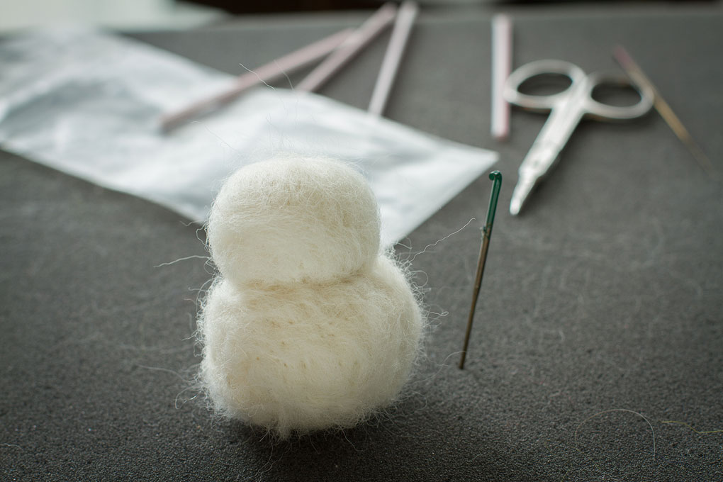 I made a smaller ball using the same method for the head, and felted the two together by poking the largest gauge needle at the neck joint.