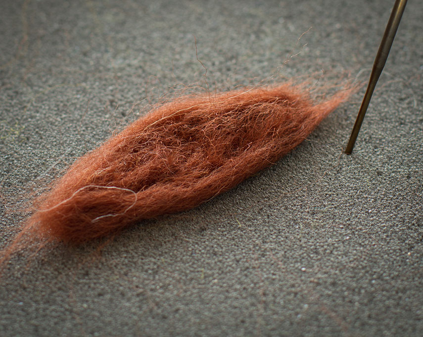 I used smaller strips of brown felting over the body to start adding detail. Felting is so intuitive – I just kept adding it wherever I thought I needed more until I had a brown back and a little heart-shaped face.