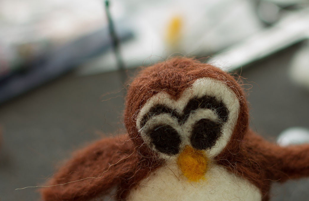 To make eyes I made two little black balls by rolling the roving in my hand like play doh, then I felted them on. Then I used the same method, but with white balls and I positioned them a bit lower, to make eyebrows. I made the beak the same way I made the wings – on the felting board first, then adding finer detail once it was on her face and trimming away the excess.