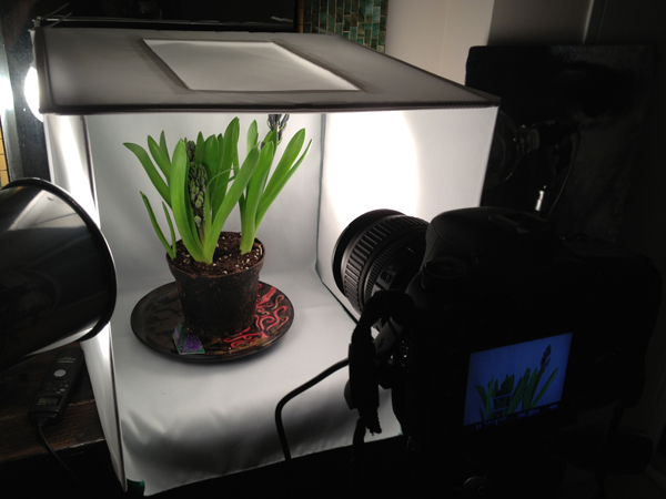 I placed the plant in a lightbox with flanking lights to try and ensure consistent lighting throughout the shooting process (just about 36 hours were recorded). As you can see, the results were lovely, but imperfect lighting-wise, and I’ll probably shoot in the dark next time so I can control the light completely. I thought about it… but didn’t want to deny the plant sunlight. Here is the set up: