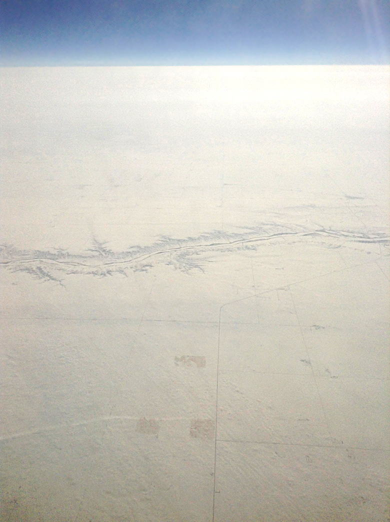 I’ve been to every province in Canada except Saskatchewan. There is a joke in Manitoba that if you just look west you can practically see it; it’s that flat, but I’ve always wanted to drive through the prairies. I took this photo today while flying over Saskatchewan, and I love how the horizon line and the river are the only features in this table of white. I’ll bet the skies feel ten times bigger there.