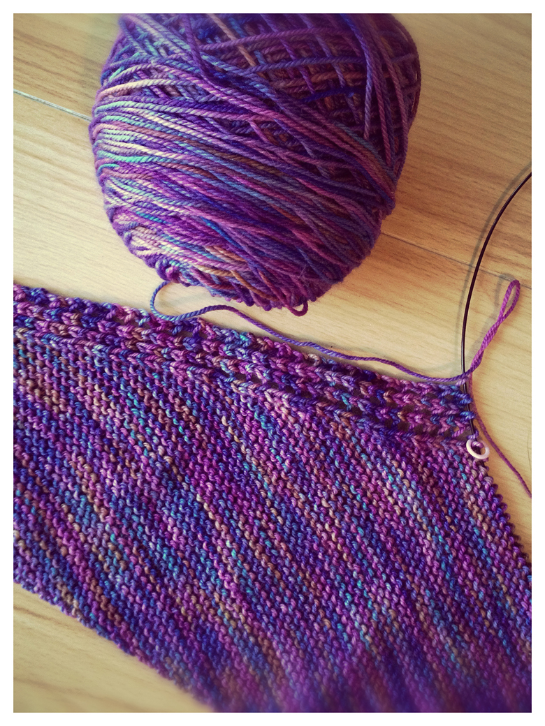 I bought this in Halifax. I haven’t a clue what it is. It’s either fingering or sport, and there’s a decent amount of it, but I’m not sure how much. Martina’s patterns are awesome because you can stop when you think you’re going to run out and you still have a useful thing at the end of it, and that makes this yarn a good candidate! Oh… and of course it’s back in my colour comfort zone…yes, this shall be my Lintilla.