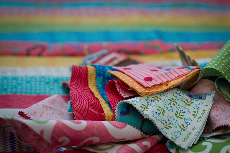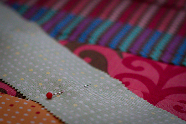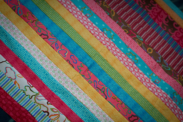 I can proudly say that this project broke the mental barrier I had against sewing :) I pinned, I sewed, I changed bobbins and threads, and I had a blast doing it. The fabric is so bright and colourful that watching the quilt grow is is a blast. It’s like variegated yarn, except that the project moves much faster and I got to pick what colour came next.