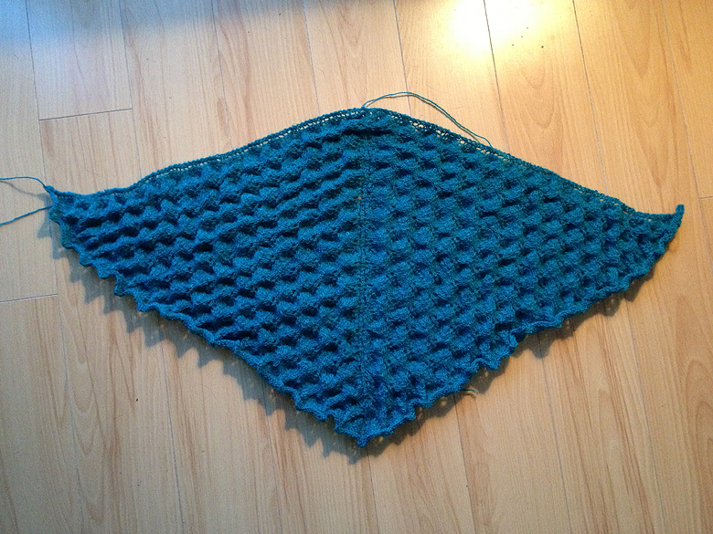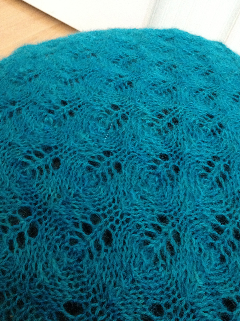 The yarn they surprised me with (from Canadian Alpaca Products) is the softest stuff imaginable, the perfect shade of turquoise and came in a generous 500 yard skein. I wanted to max it out, so I went with the Shetland Triangle Lace Shawl by Evelyn A. Clark.