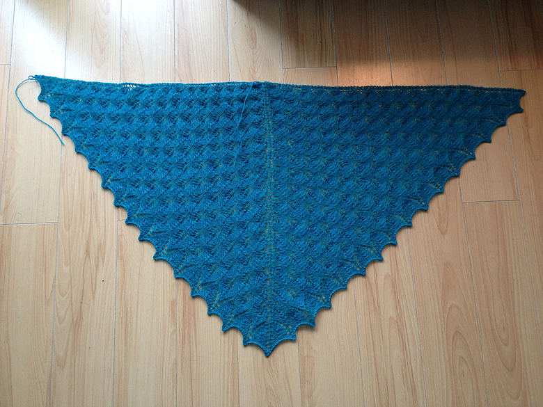 The pattern allows you to go as big as you dare, as long as you leave enough for the final chart and cast off. I went 5 repeats more than the recommended size, resulting in a shawl 44 x 22. The shawl is so soft and luxurious, I’m already casting on for another alpaca project.