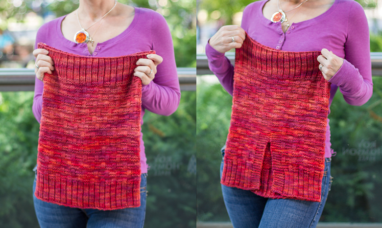 Split section (you will now switch from working in the round to working back and forth, keeping the 6 stitches of garter stitch on both sides of the split. At the end of every row, turn your work.)