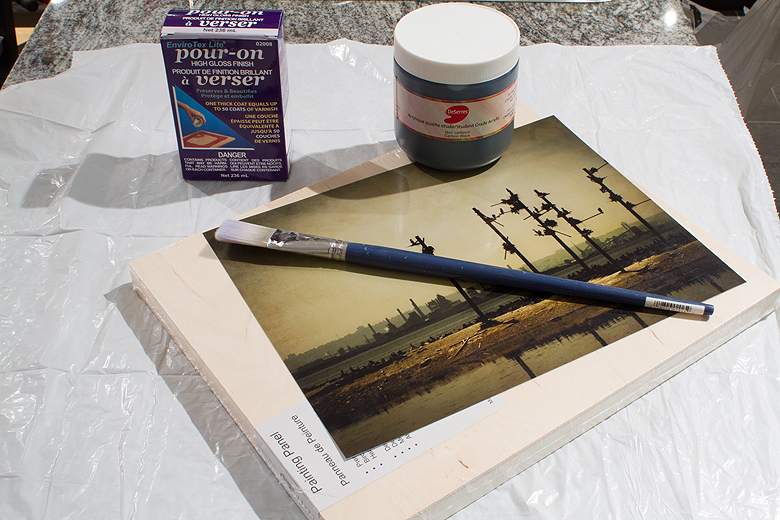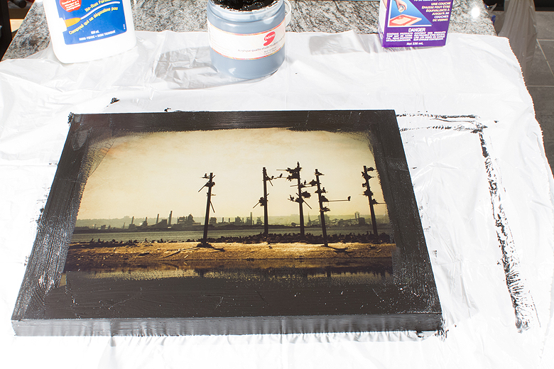 I bought the resin, a wooden canvas that was larger than my photo, Elmers glue, black acrylic paint and a large paintbrush. For those of you interested, my print is a photo I took of the cormorants under the Burlington Skyway, aiming towards the Hamilton Steel Mills. The print was done at Pikto in the Distillery District, and is printed to Kodak Metallic.