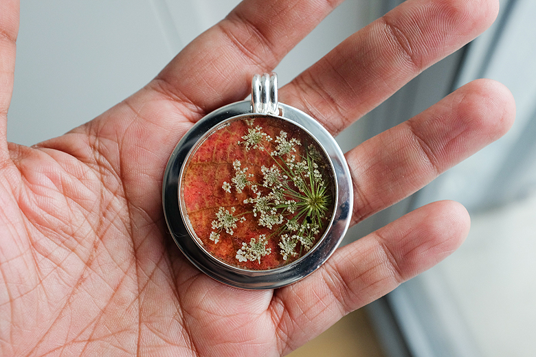 The Queen Anne’s lace is separated from the maple leaf base by a layer of resin a few millimetres thick, to give that shadowbox effect.