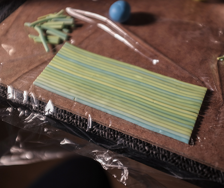 I used my extruder to combine the colours and stacked them into a cane. Then I marbled what was left and used it to get a first coat of clay onto the bangle. I sliced up my cooled cane thinly and applied it across the bangle, blending carefully with the other slices, and also with the clay base.