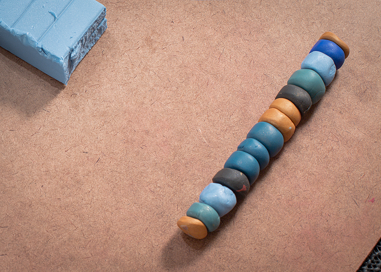 Step 11 – When it was totally covered I wrapped a piece of clay around the area where the joins were. I covered up the joins and then used a small ball-head tool to push in 3 dents to seal that connection.