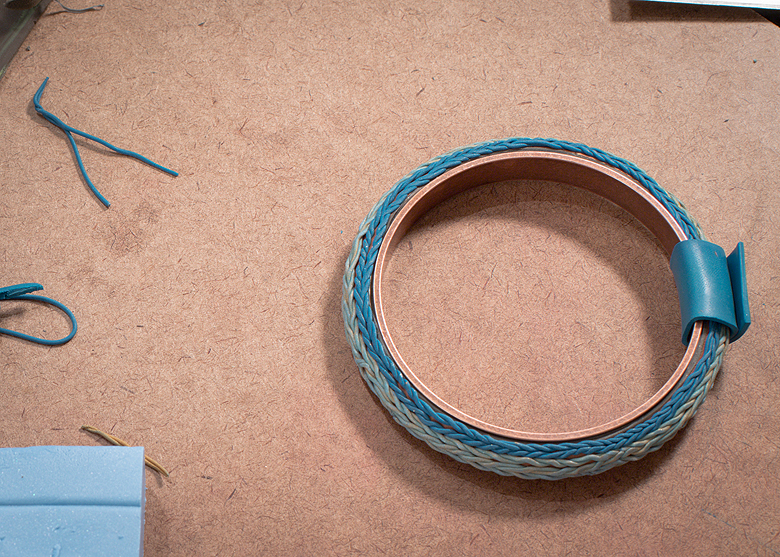 Step 10 – I carefully wrapped this twist around my bangle. I made another twist, but my second one was twisted counter-clockwise. I added this twist to the bracelet as well. I kept building it up in this way, slowly covering all the brown clay with ‘faux knitting’ by alternating clockwise and counter-clockwise twisted ropes of clay. I made sure that all my strands started and ended in the same spot so I could keep the messy looking part of the bangle localized.